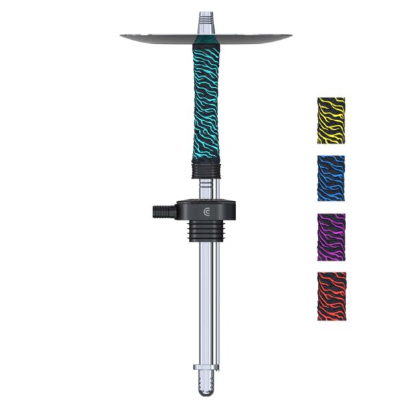 The Corsair Lava Hookah is a Russian-made hookah known for its elegant and minimalist design. It features a stainless-steel stem and metal components, complemented by a silicone cover with lava-like detailing. The hookah includes an adjustable diffuser with three levels, allowing users to customize their smoking experience from restricted to wide open. The smoke is purged through the top of the stem, enhancing the visual appeal during use.