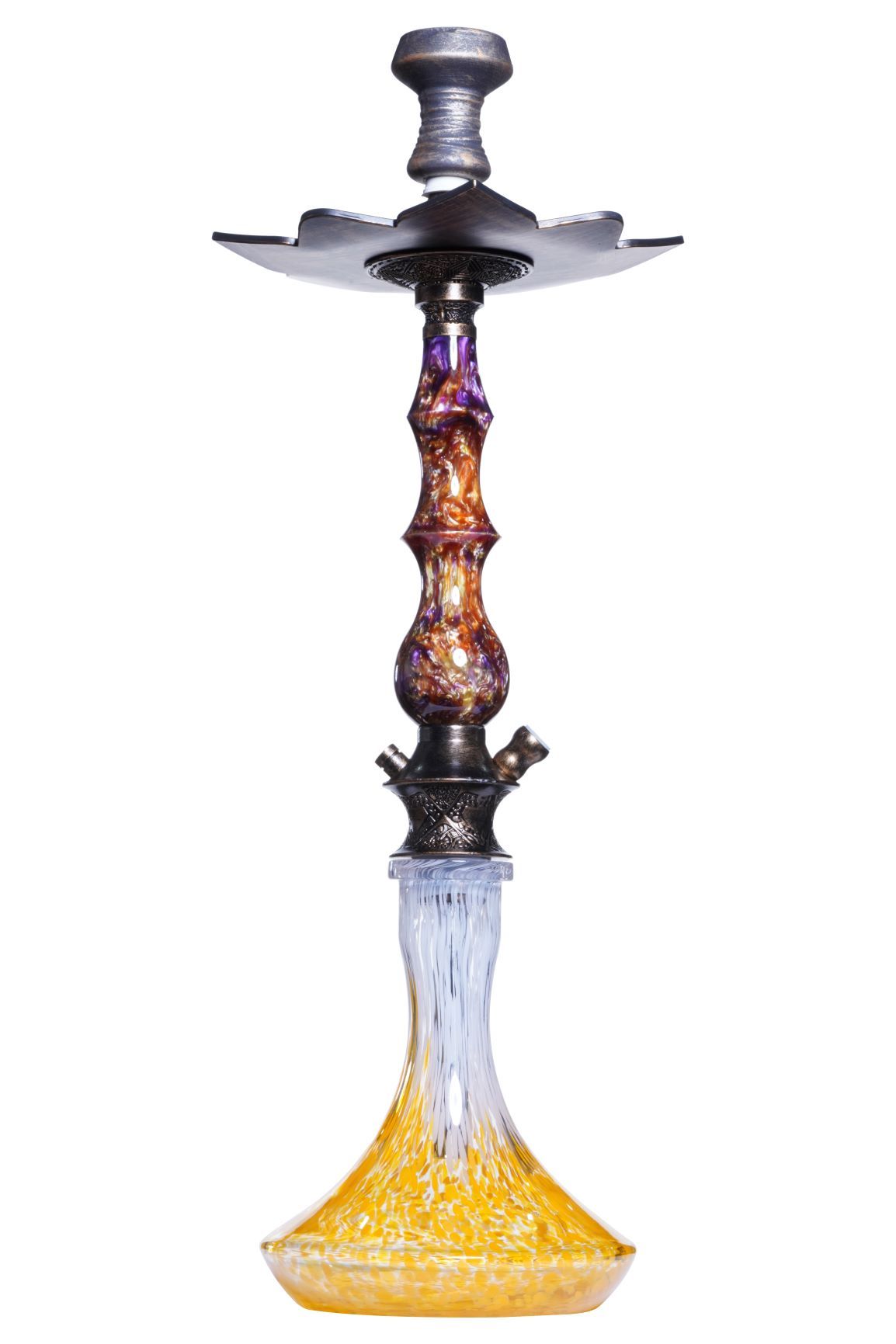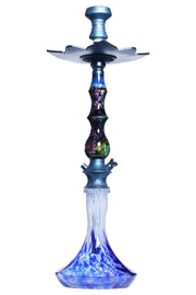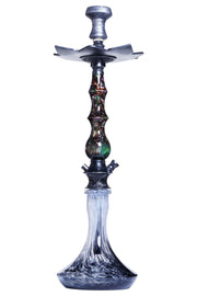 The D Hookah Royal is a true treasure and its beauty is in it's sleek resin stem accented with patterned metal parts. The hookah is complimented with matching parts all around and lotus designed tray. The base is made of thick durable glass and the shape makes it stable and sturdy.