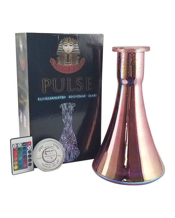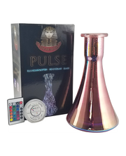 The Pulse illuminated hookah glass base is a great replacement base for most medium to large size hookahs. The glass base comes with a LED light puck and remote that fits underneath the glass base and lights up to create an amazing hookah session. The base is 12in in height and has a 2in opening diameter.